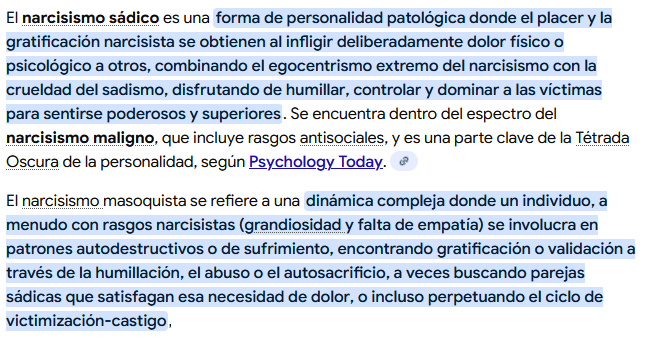 A mi me juega en contra esto de que me gustan las mujeres jovenes, porque pues los narcisistas tienden a hacer algo que se llama "la difamación narcisista o el descarte narcisista" y se aprovechan de que pie cojeas para exponerte delante de los demás y "demostrar" que eres una mala persona. :/