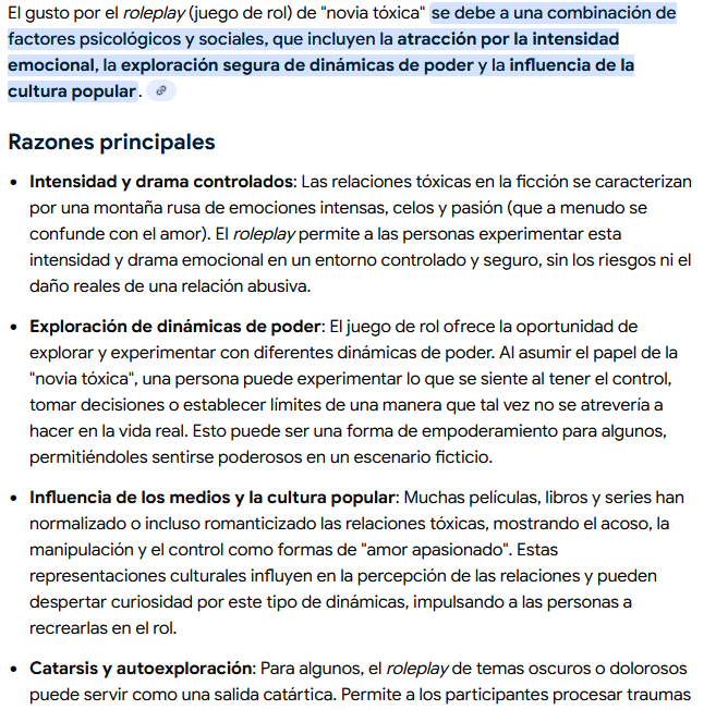 "lo raro" de mi personalidad, es que por alguna extraña razón que no entiendo, es que me "atraen" las mujeres que presentan esos rasgos de personalidad. Tanto makima como Reze me parecen "encantadoras" xD aunque se que son lo peor que me podria encontrar en una relación de pareja. :/ Es como "el roleplay de novia toxica"? que hay mucha gente que le gusta y no entienden por qué?
