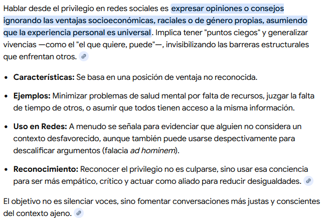 Es como la frase de Bennedetti de cuando la vida te saca a empujones... xd Pareciera que aveces la vida te saca de tú zona e confort para aprender nuevas habilidades o "adaptarte" a nuevas cosmovisiones o maneras de entender la realidad. Es como eso de "actuar bajo el privilegio" ya saben eso de las redes sociales, donde una persona no es capaz de ver "las carencias" de otros, porque tienen sesgos o viven y hablan desde el privilegio? :/ Algo así me esta pasando, debo aprender a vivir de manera más "culera" para valorar lo que antes tenia.